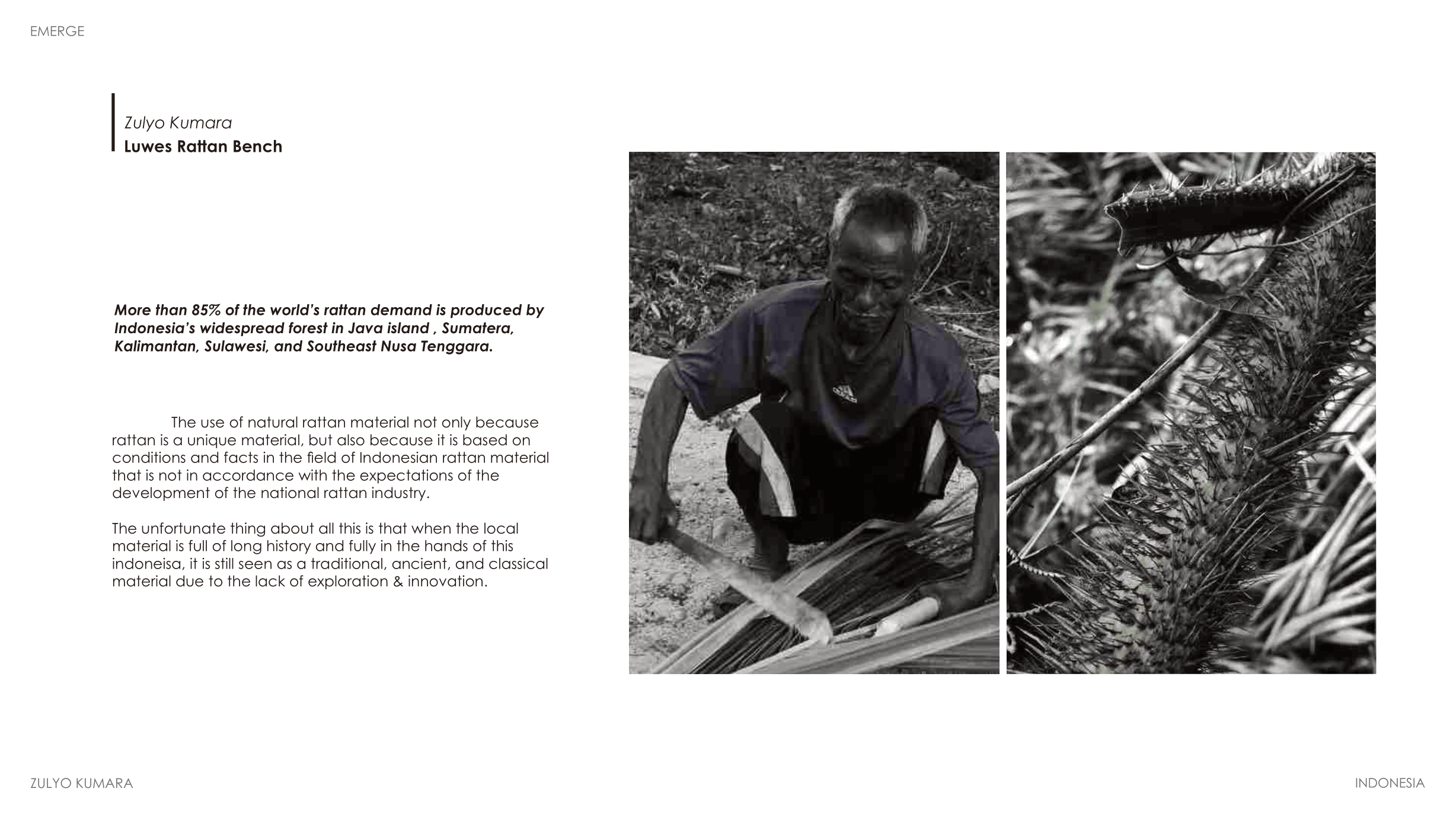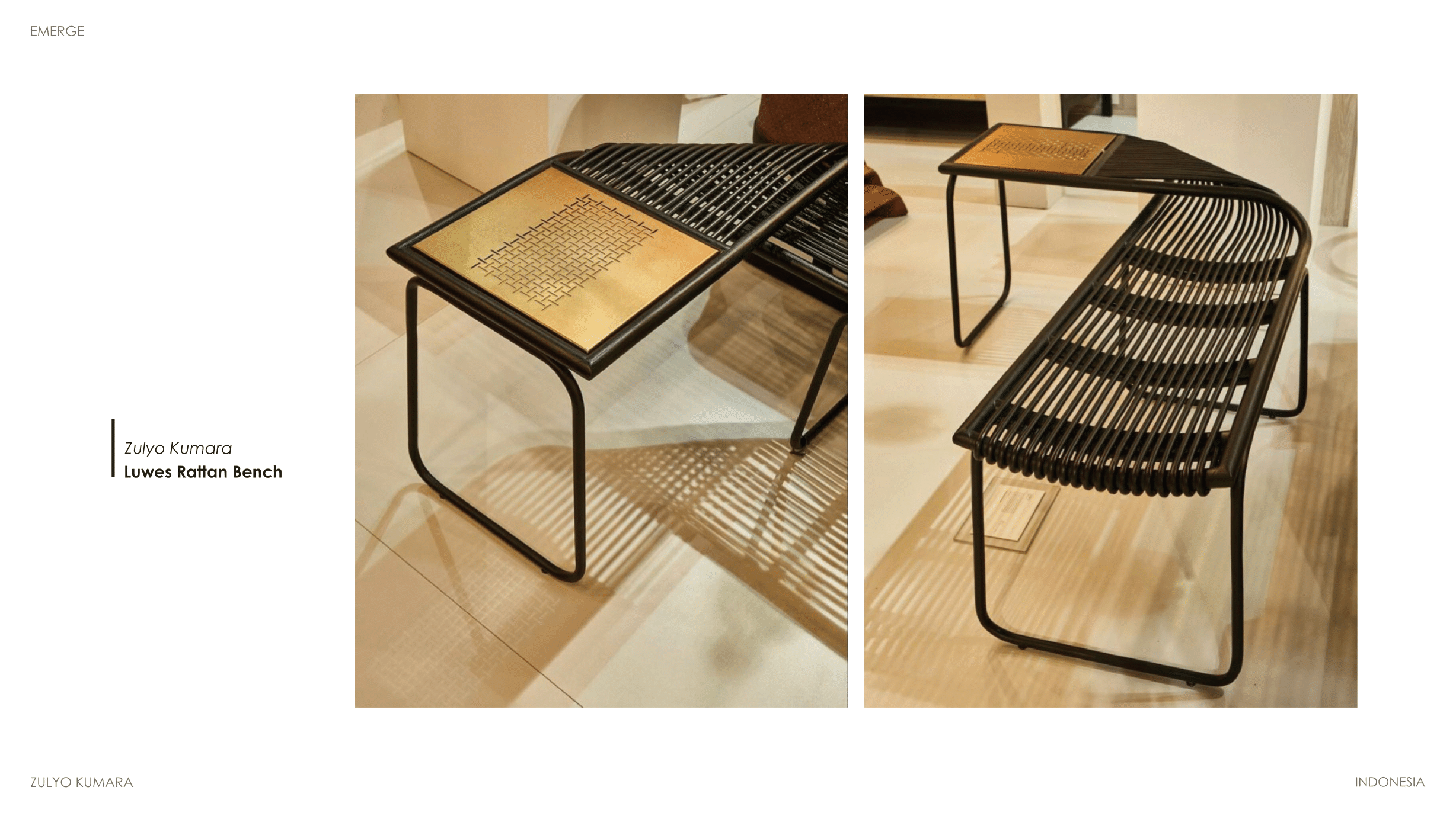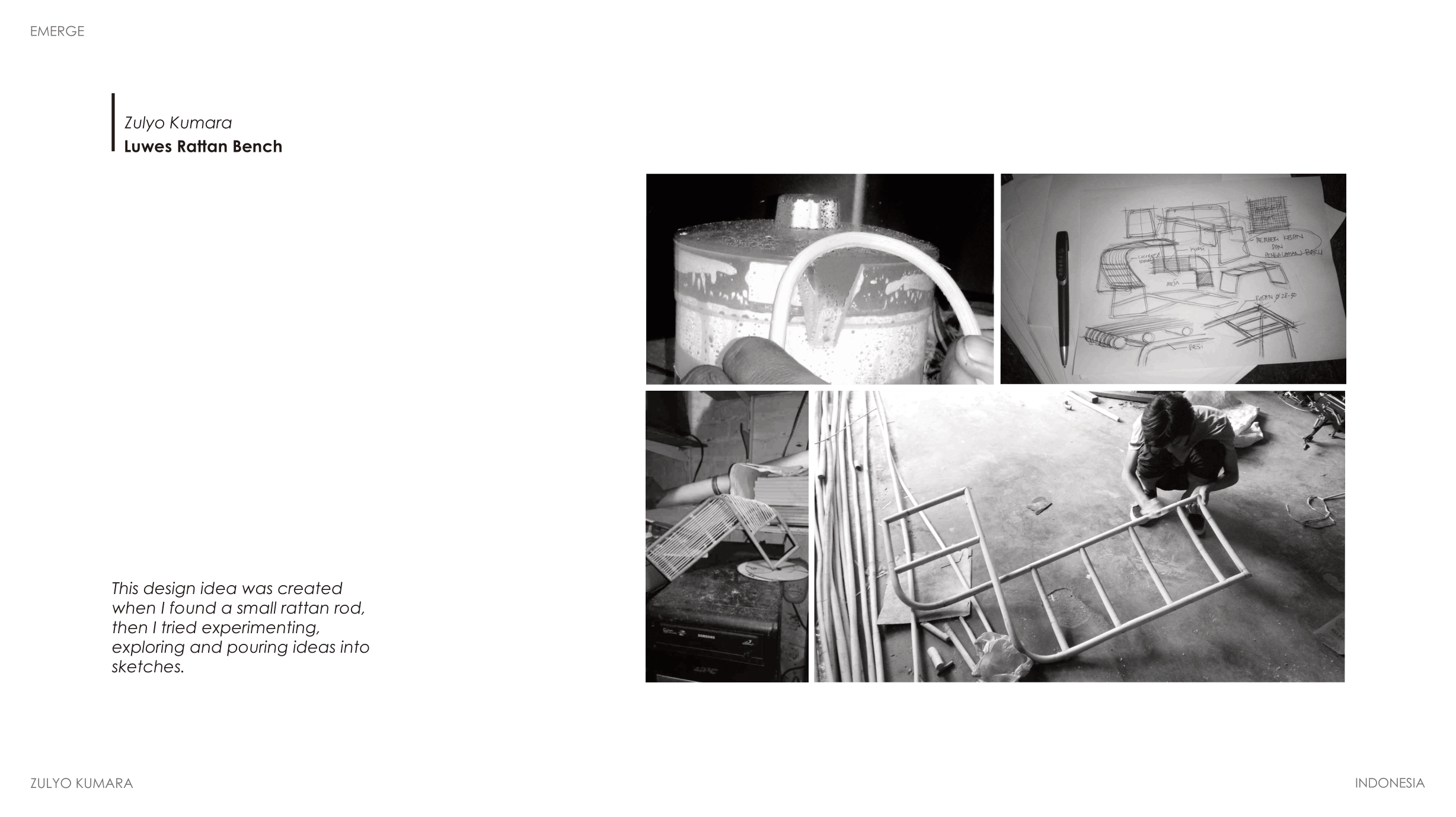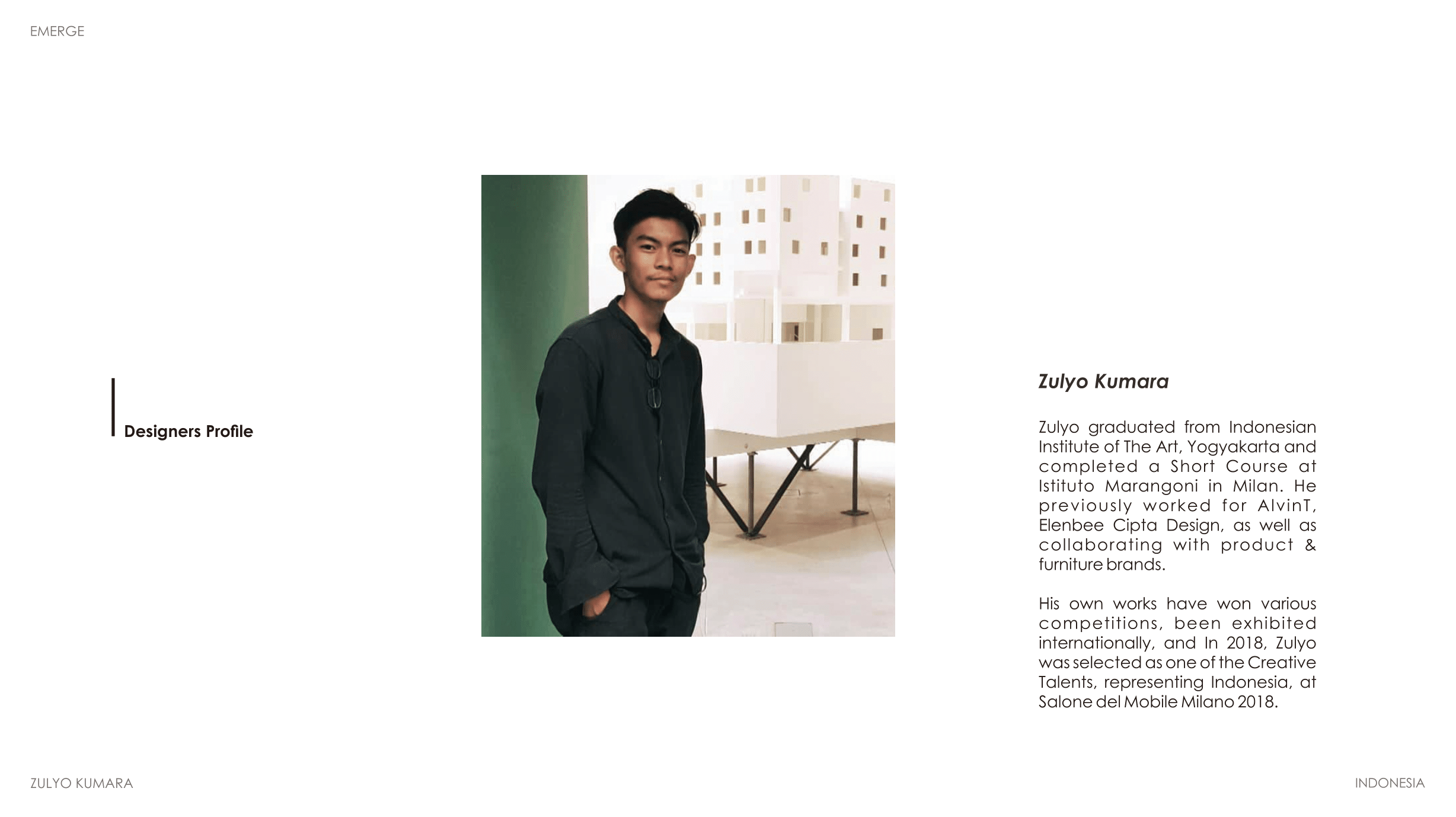 Zulyo graduated from Indonesian Institute of The Art, Yogyakarta and completed a Short Course at Istituto Marangoni in Milan. He previously worked for AlvinT, Elenbee Cipta Design, as well as collaborating with product & furniture brands.
