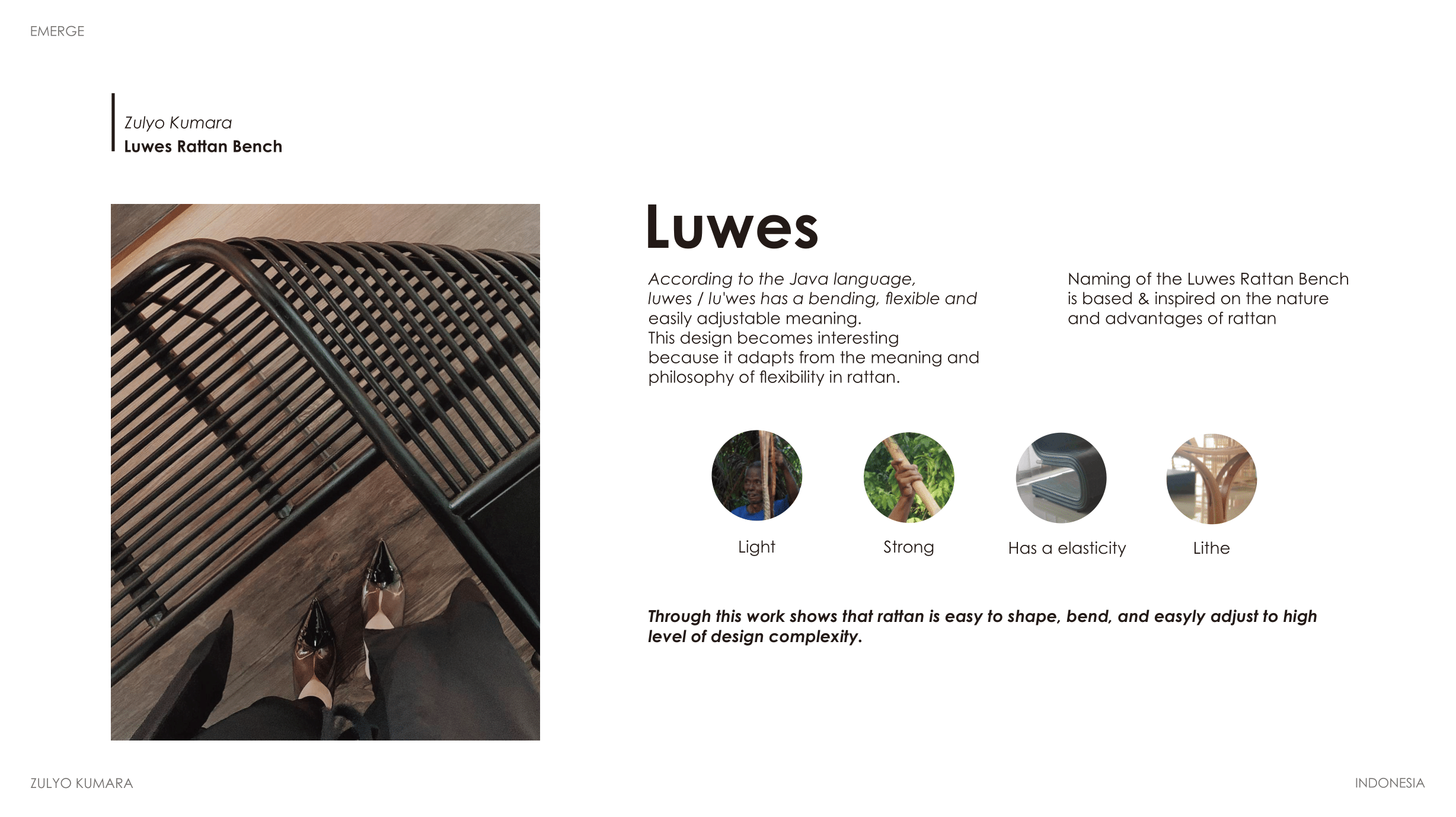 His own works have won various competitions, been exhibited internationally, and In 2018, Zulyo was selected as one of the Creative Talents, representing Indonesia, at Salone del Mobile Milano 2018.